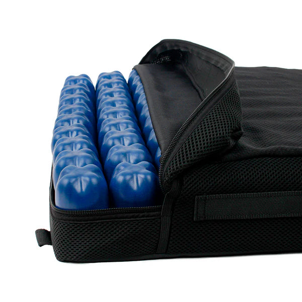 Destaque: O design celular e o material maleável permitem que o indivíduo fique imerso na almofada para redistribuição máxima da pressão, enquanto diminui o atrito e o cisalhamento. Ao sentar-se uma almofada se ajusta à forma do indivíduo, minimizando a deformação e a tensão do peso do corpo e por consequência possibilitando melhor ativação no fluxo sanguíneo. Fornecer o nível ideal de estabilidade sentado, oferecendo proteção máxima da pele e dos tecidos moles