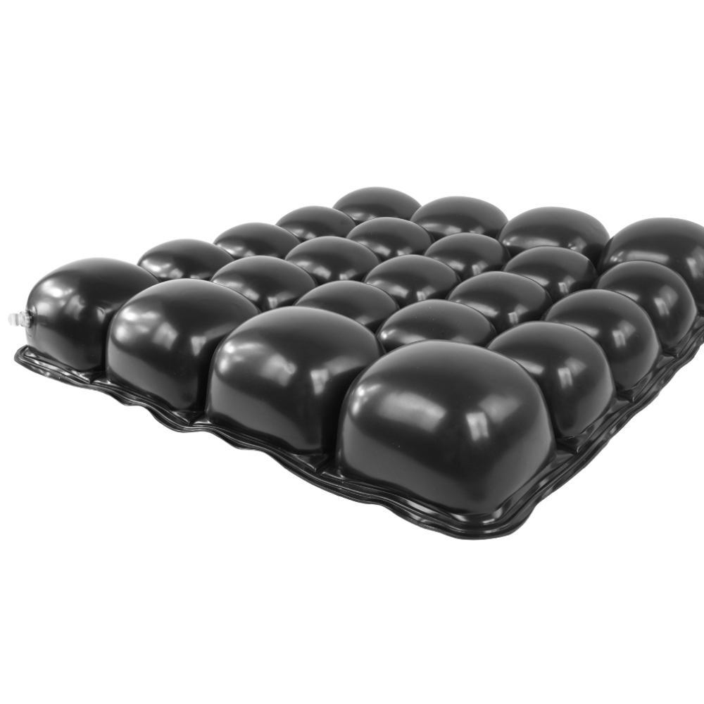 Destaque: Design celular e o material maleável permite que o indivíduo seja imerso na almofada para a redistribuição máxima de pressão, enquanto diminui o atrito e o cisalhamento. Ao sentar-se a almofada se ajusta à forma do indivídup, minimizando a deformação e tensão do peso do corpo e por consequência possibilitando melhor ativação do fluxo sanguíneo