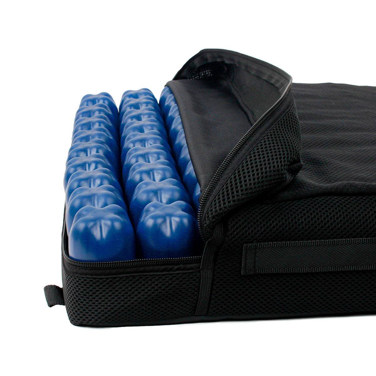 Destaque: O design celular e o material maleável permite que o indivíduo seja imerso na almofada para redistribuição máxima da pressão, enquanto diminui o atrito e o cisalhamento. Ao sentar-se a almofada se ajusta à forma do indivíduo, minimizando a deformação e tensão do peso do corpo e por consequência possibilitando melhor ativação no fluxo sanguíneo.