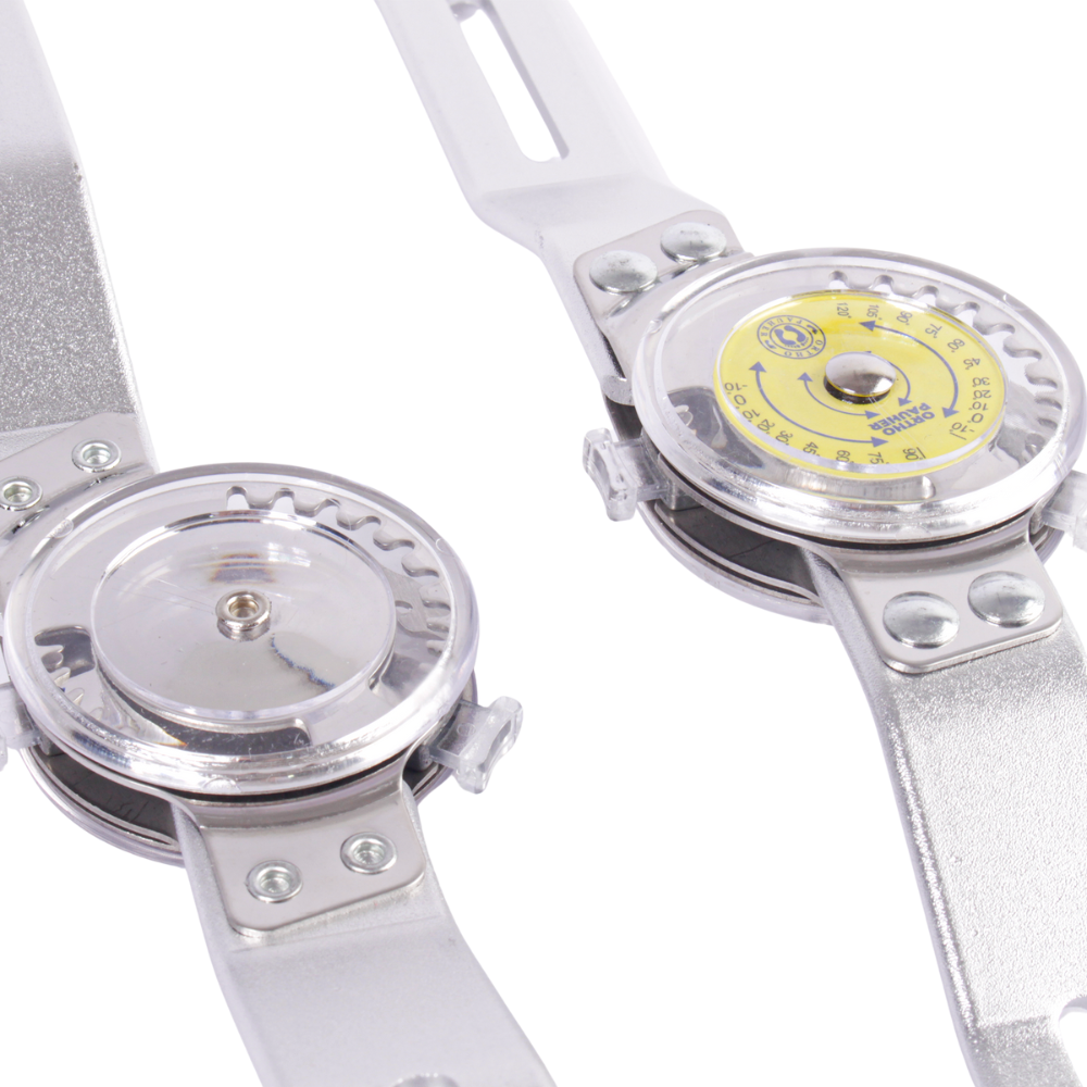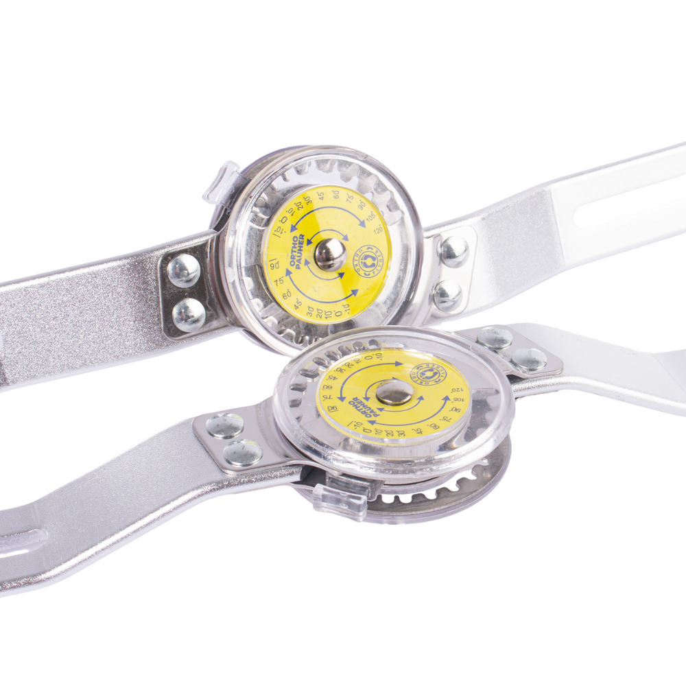 Destaque: Órtese de articulação de quadril com dobradiças flexíveis para adultos e crianças. Componentes utilizados na confecção de uma órtese externa para membro inferior, isto é, de um aparelho ortopédico externo fabricado sob medida, aplicado externamente para estabilizar ou modificar as características estruturais e funcionais do sistema neuro-muscular e esquelético de membros inferiores.