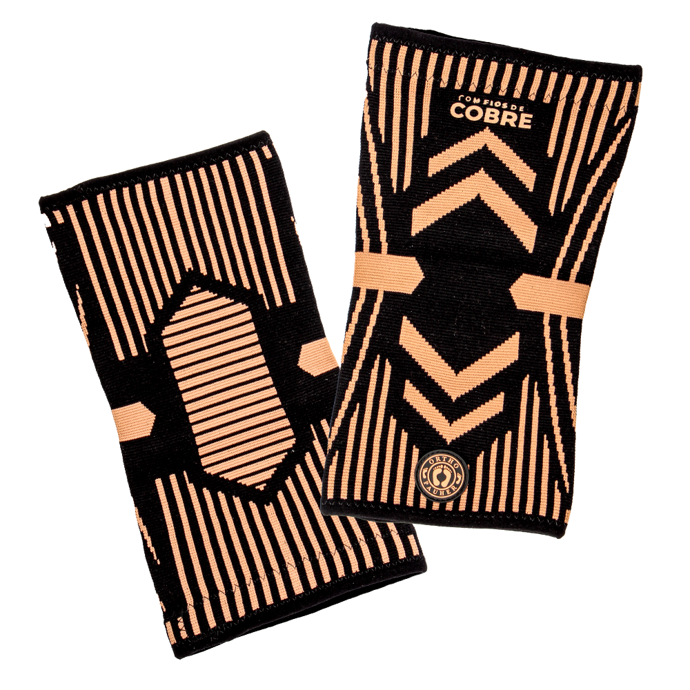 Destaque: As fibras de COBRE incorporadas ao tecido possuem propriedades antimicrobianas e anti-odor, contribuindo para a manutenção da higiene e favorecendo o ambiente Fios de cobre bactericida, compressão e aquecimento. A compressão ainda estabiliza a articulação, prevenindo movimentos bruscos que poderiam agravar lesões.