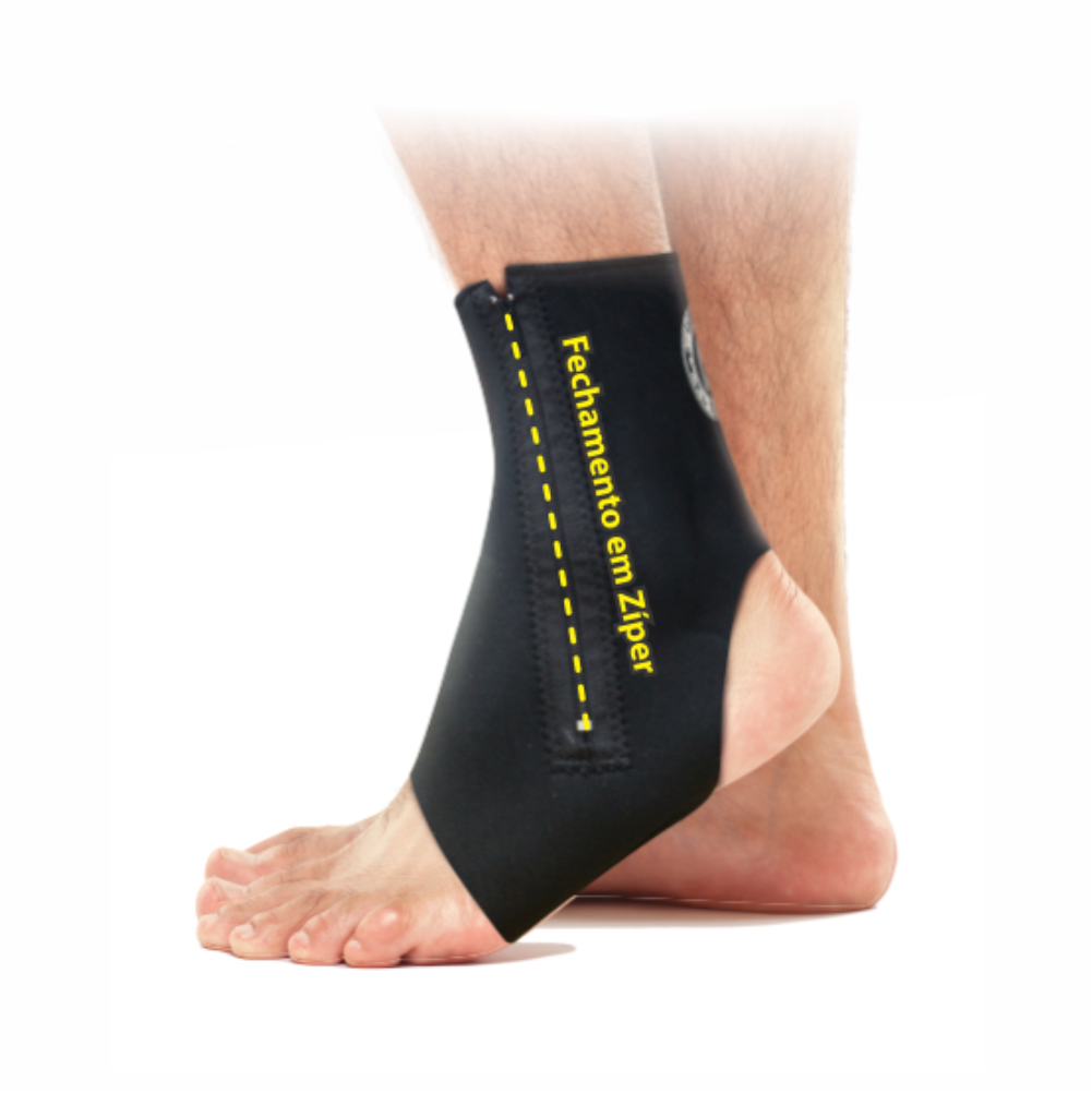 Destaque: Feito em Neoprene oferece compressão e suporte em torno do tornozelo, retém o calor mantendo a região aquecida, melhorando a sensação de estabilidade da articulação.